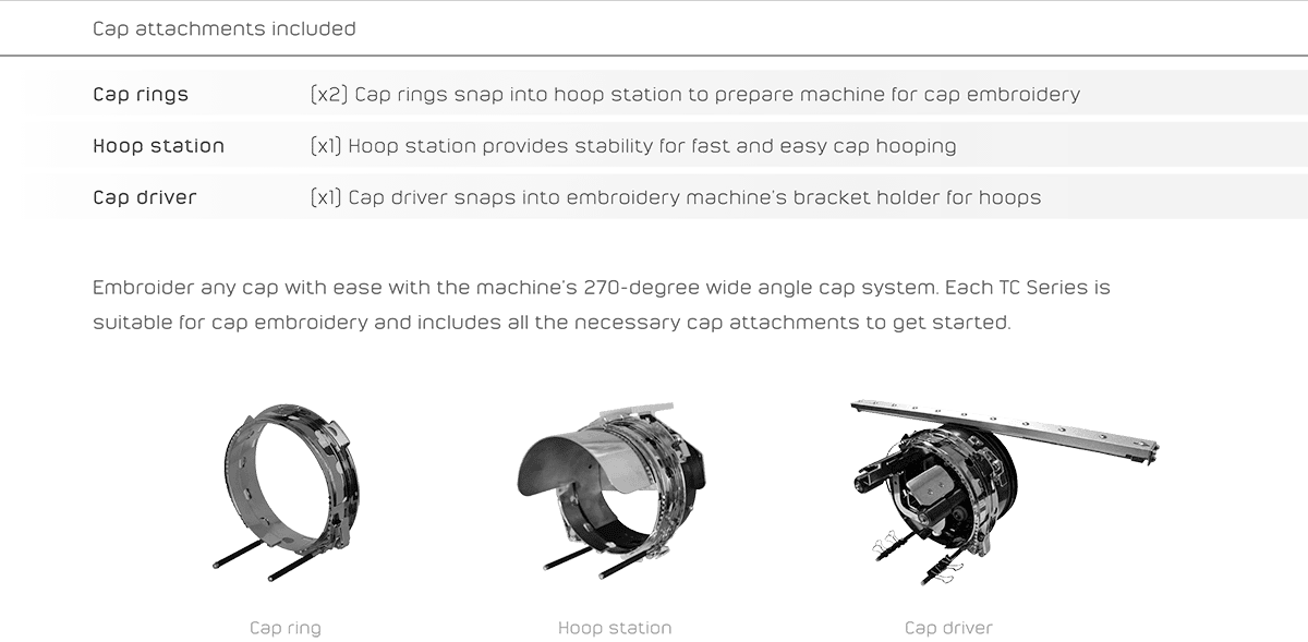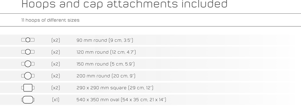 - 11 hoop sizes for a variety of embroidery needs including flats, caps, finished garments and more!
